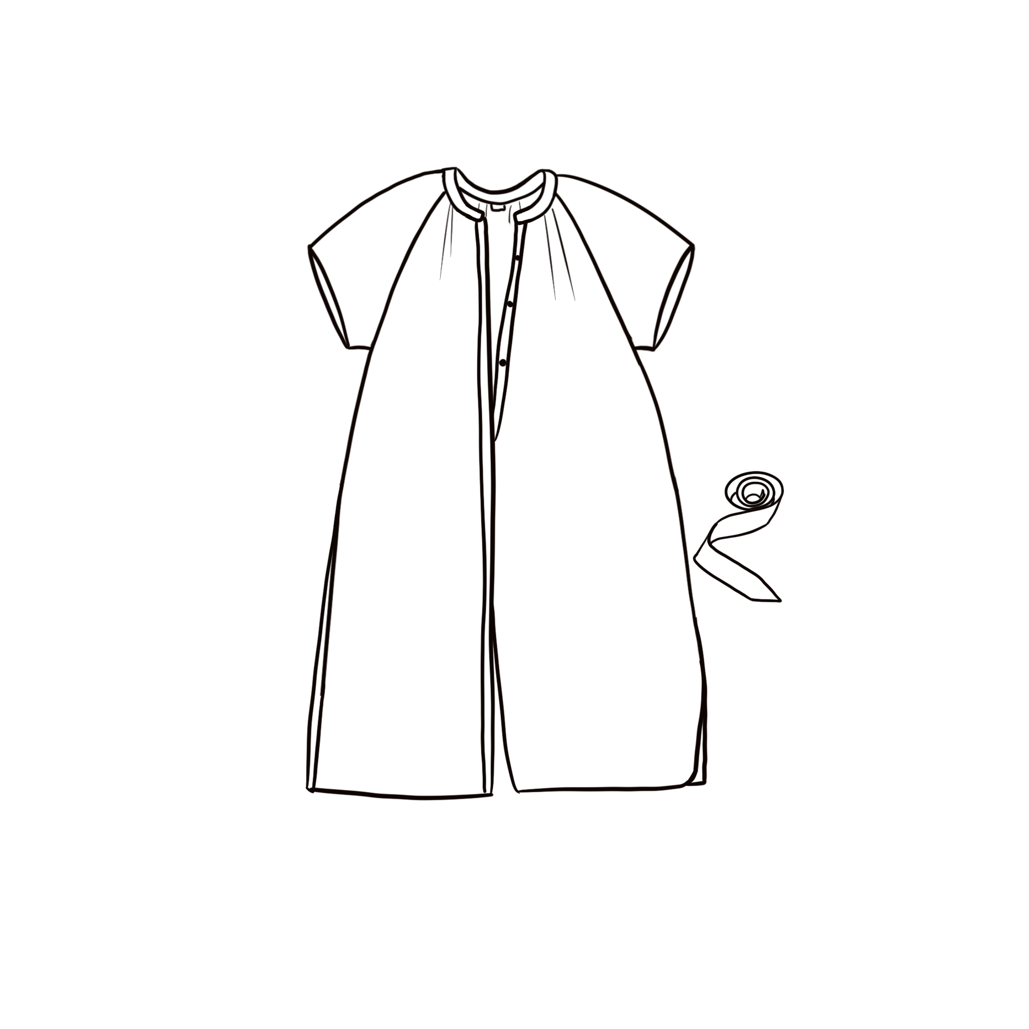 Dress buttoned from top to bottom with mother of pearl buttons, short sleeves.